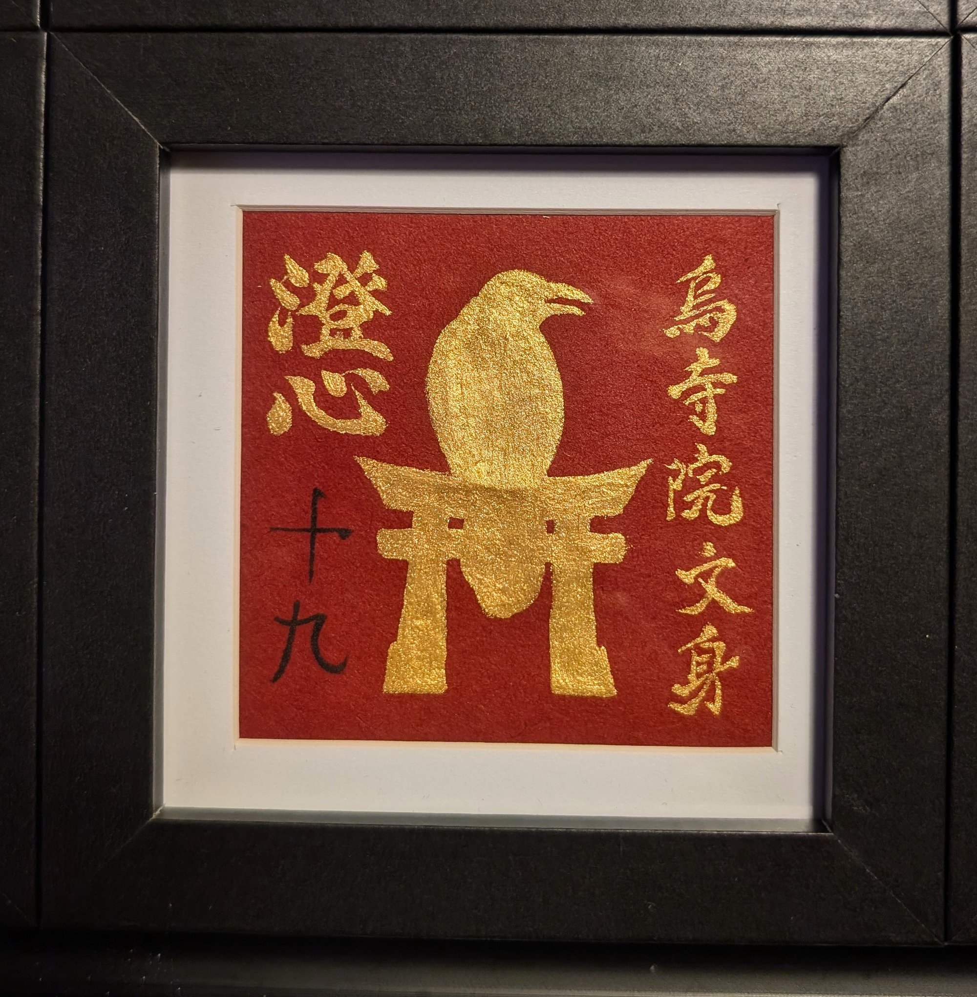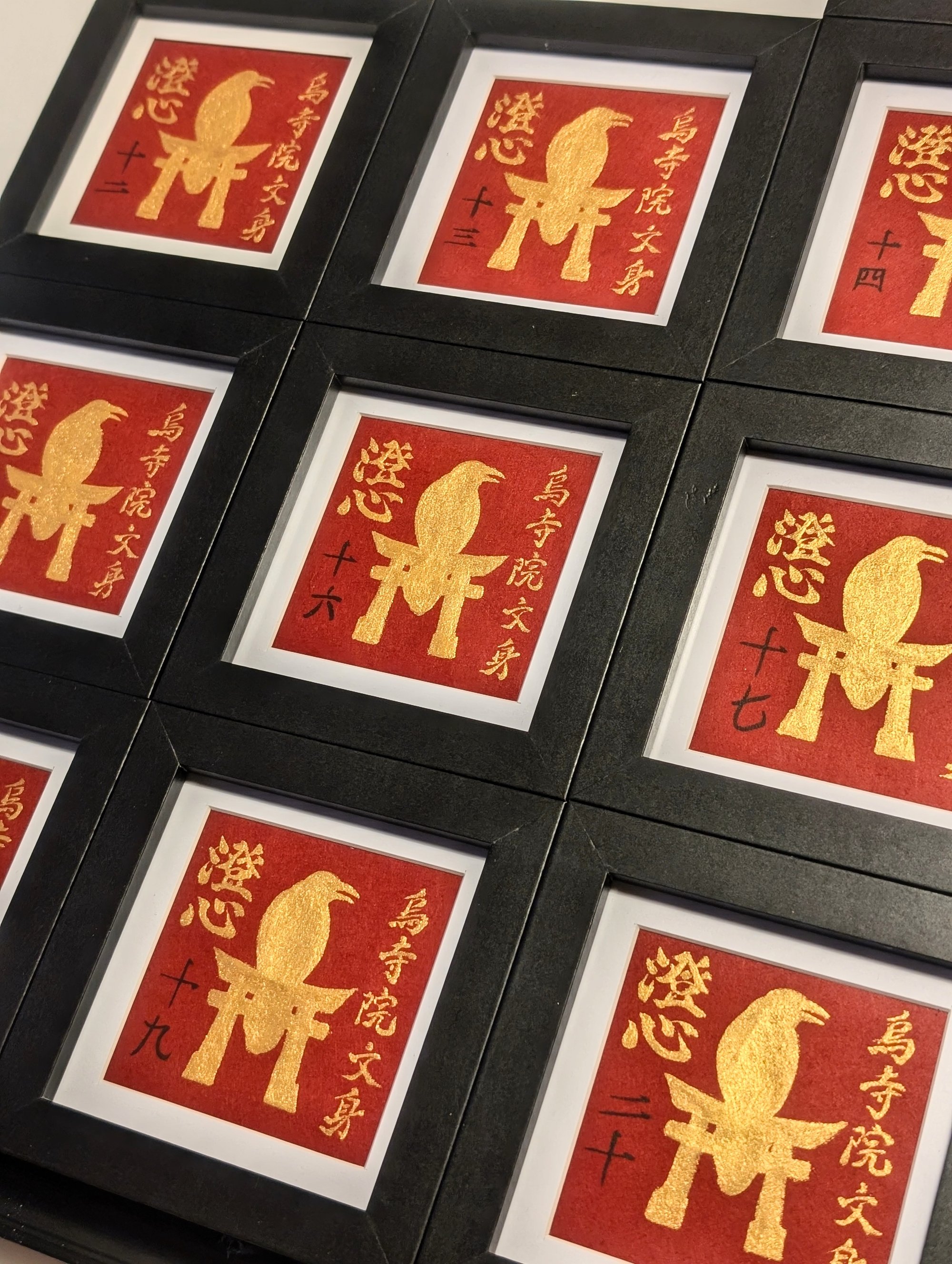 Chōshin mantra Hand-Painted with golden Sumi ink on red handmade Washi paper featuring The Crow Temple Tattoo kanji and emblem.